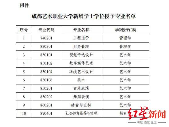 “日前批復(fù)同意成都藝術(shù)職業(yè)大學(xué)新增為學(xué)士學(xué)位授予單位,也就說(shuō)明學(xué)校目前具備學(xué)士學(xué)位授予資格?!庇嗵煜璞硎荆着猩?0個(gè)本科專業(yè)取得了學(xué)士學(xué)位授予權(quán),就意味著就讀成都藝術(shù)職業(yè)大學(xué)首批10個(gè)專業(yè)的學(xué)生都可以有機(jī)會(huì)獲得學(xué)士學(xué)位。
